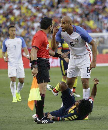 John Brooks of the United States, argues with the linesman after he fouled Colombia's Juan Cuadrado during a Copa America Centenario Group A soccer match at Levi's Stadium in Santa Clara, Calif., Friday, June 3, 2016. (AP Photo/Marcio Jose Sanchez) The Associated Press