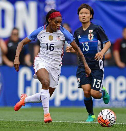 United States forward Crystal Dunn, left, dribbles away from Japan midfielder Rika Masuya during the first half of an international friendly soccer match Sunday, June 5, 2016, in Cleveland, Ohio. (AP Photo/David Dermer)