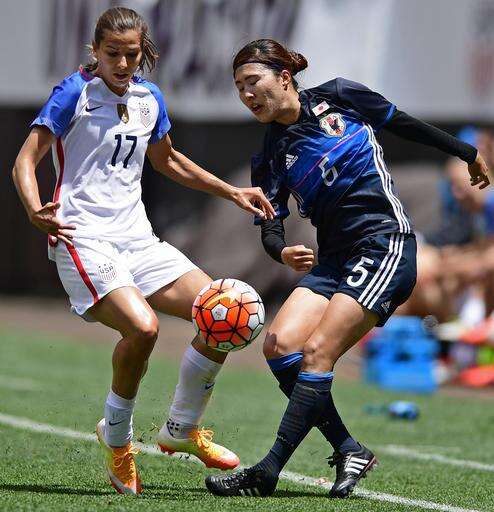 United States midfielder Tobin Heath, right, plays the ball ahead of Japan midfielder Ami Sugita during the first half of an international friendly soccer match Sunday, June 5, 2016, in Cleveland, Ohio. (AP Photo/David Dermer)