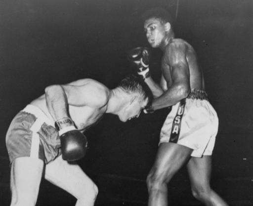 FILE - In this Oct. 29, 1960, file photo, Cassius Clay, in white trunks, who later changed his name to Muhammad Ali, is shown in his professional boxing debut, in Louisville's Freedom Hall, against Tunney Hunsaker. The day before his star-studded funeral, members of Muhammad Ali's Islamic faith will get their chance to say a traditional goodbye to the Champ. Bob Gunnell, a spokesman for Ali's family, announced Monday, June 6, 2016, that a Jenazah, a traditional Muslim funeral service, will be held at Freedom Hall at noon Thursday. (AP Photo/File)