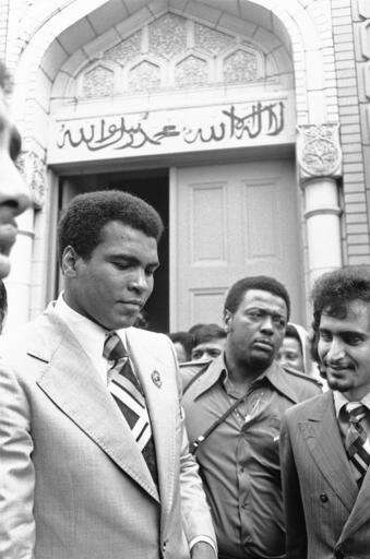 FILE - In this June 25, 1976, file photo, world heavyweight boxing champion Muhammad Ali, left, steps out of a Muslim mosque in Tokyo. The day before his star-studded funeral, members of Muhammad Ali's Islamic faith will get their chance to say a traditional goodbye to the Champ. Bob Gunnell, a spokesman for Ali's family, announced Monday, June 6, 2016, that a Jenazah, a traditional Muslim funeral service, will be held at Freedom Hall in Louisville, Ky., at noon Thursday. (AP Photo/Nick Ut, File)
