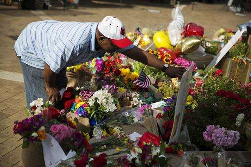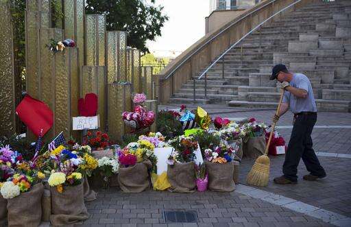 A worker sweeps up around a makeshift memorial to Muhammad Ali at the Muhammad Ali Center, Monday, June 6, 2016, in Louisville, Ky. The president of Turkey and king of Jordan joined the long line of world leaders, religious figures and superstars set to speak at Ali's funeral Friday. (AP Photo/David Goldman)