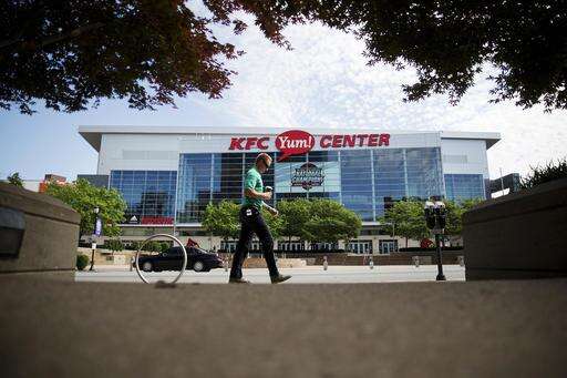 A pedestrian passes the KFC Yum! Center where Muhammad Ali's public funeral service on Friday will be held Monday, June 6, 2016, in Louisville, Ky. The president of Turkey and king of Jordan joined the long line of world leaders, religious figures and superstars set to speak at Ali's funeral Friday. (AP Photo/David Goldman)