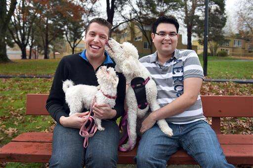 In this Nov. 28, 2015 photo, Jeremy Mark, left, and David Beltier, sit with their dogs, Beauty and Princess, near their home in Hillsboro, Ore. In March 2013, Beltier was walking with boyfriend Mark, and their poodle when a man in a truck began yelling homophobic slurs at the pair, got out of his truck and began punching Beltier. The man, leaving at one point to grab a metal tool from the truck and hit Beltier again in the head, was later charged with state and federal hate crimes. Yet what happened to Beltier was never included in the FBI's national hate crimes report because the Hillsboro Police Department was among those found to be not reporting to the FBI during the six-year period of 2009-2014 examined by The Associated Press. (AP Photo/Steve Dykes)