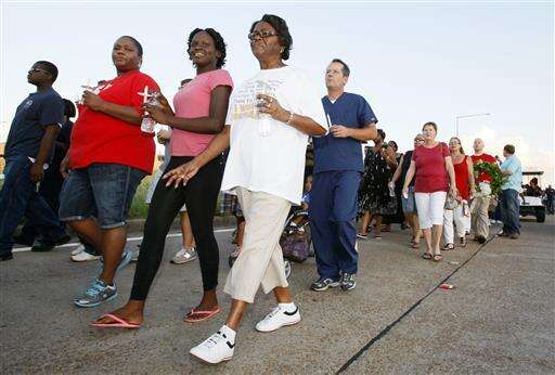 FILE - In this Sunday, Aug. 14, 2011 file photo, people march to the site where James Craig Anderson, a black man, was allegedly rundown by a white teenager in June 26, 2011 in Jackson, Miss. Jackson Police did not file any hate crimes information to the FBI between 2009 and 2012, followed by only spotty reporting the next two years. And yet, during that time, state and federal charges were filed in connection with the June 2011 death of Anderson, who was beaten and run over by a truck containing a group of white teenagers, some of whom yelled racial epithets during the assault. (AP Photo/Rogelio V. Solis)