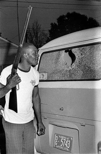 FILE - In this April 8, 1965 file photo, Robert Hicks, vice president of the Bogalusa Voters League, holds a rifle as he inspects damage to a vehicle belonging to a group of university students that was hit by a passing vehicle while it was parked in front of his home in Bogalusa, La. Hicks said he shot back at the attackers. (AP Photo, File)