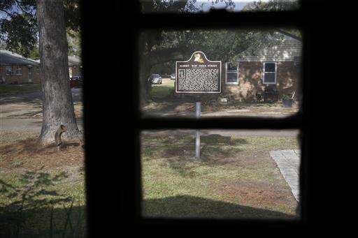 In this Dec. 11, 2015 photo, a historic marker is seen from inside the childhood home of Barbara Hicks Collins, now listed on the National Register of Historic Places, in honor of her father, civil rights activist Robert Hicks, in Bogalusa, La. The home was both the site of mobilization of civil rights activism, and the target of Ku Klux Klan hostility. (AP Photo/Gerald Herbert)