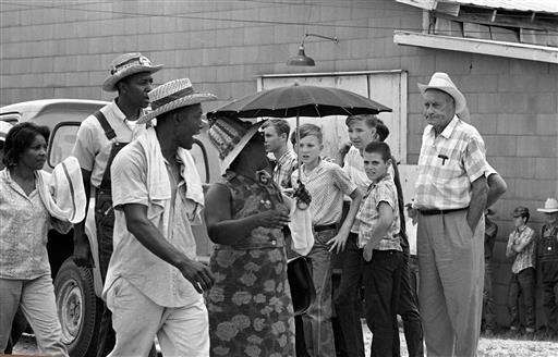 FILE - In this July 11, 1966 file photo, Robert Hicks, vice president of the Bogalusa Voters League, second from left, and other demonstrators chant as they pass white onlookers upon their arrival in Franklinton, La., concluding a two-day march from Bogalusa, La. Several hundred demonstrators ended the hike with a rally at the courthouse. (AP Photo/Jack Thornell, File)