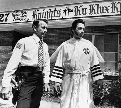 FILE - In this April 16, 1976 file photo, Bill Wilkinson, state grand dragon of the âInvisible Empire Knights of the Ku Klux Klan", and armed body guard Johnny Jones, look over the dedication site for a KKK headquarters in Bogalusa, La. The paper mill town was a civil rights hot-spot in the 1960s. (AP Photo, File)