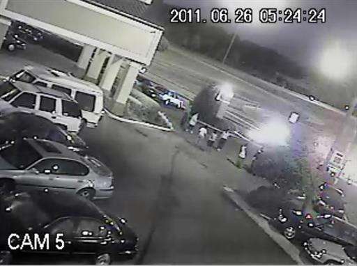 FILE - In this June 26, 2011 image made from security surveillance video, people gather in a parking lot next to the Jackson, Miss., street where James Craig Anderson, a 49-year-old black man was allegedly run down by a pickup truck driven by Deryl Dedmon, a white teen. Jackson Police did not file any hate crimes information to the FBI between 2009 and 2012, followed by only spotty reporting the next two years. And yet, during that time, state and federal charges were filed in connection with the June 2011 death of Anderson, who was beaten and run over by a truck containing a group of white teenagers, some of whom yelled racial epithets during the assault. (AP Photo)