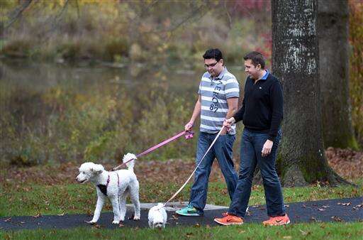In this Nov. 28, 2015 photo, Jeremy Mark, right, and David Beltier, walk their dogs, Beauty and Princes, near their home in Hillsboro, Ore. In March 2013, Beltier was walking with boyfriend Mark, and their poodle when a man in a truck began yelling homophobic slurs at the pair, got out of his truck and began punching Beltier. The man, leaving at one point to grab a metal tool from the truck and hit Beltier again in the head, was later charged with state and federal hate crimes. Yet what happened to Beltier was never included in the FBI's national hate crimes report because the Hillsboro Police Department was among those found to be not reporting to the FBI during the six-year period of 2009-2014 examined by The Associated Press. (AP Photo/Steve Dykes)