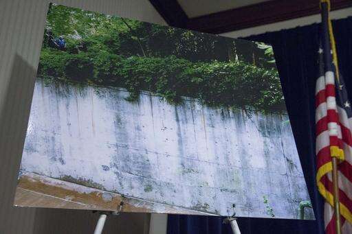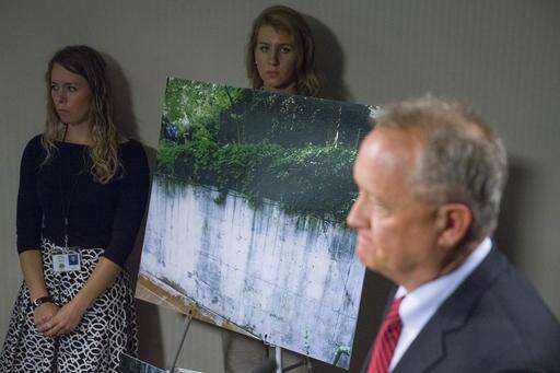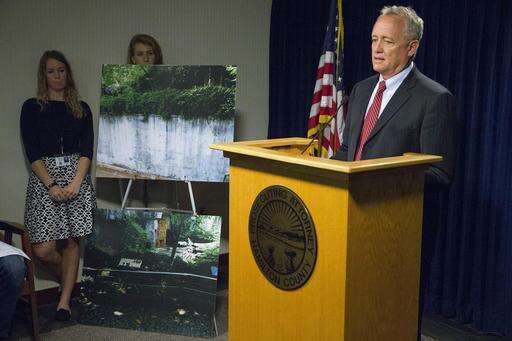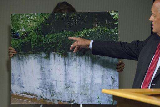 Hamilton County Prosecutor Joe Deters points to an image of the moat wall of the Gorilla World enclosure as he speaks to members of the media during a news conference on an incident involving a child who was hurt after circumventing its barriers and fell into the moat, Monday, June 6, 2016, in Cincinnati. A gorilla named Harambe was killed by a special zoo response team on Saturday, May 28, after concluding the 3-year-old boy's life was in danger. (AP Photo/John Minchillo)
