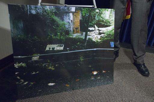 An image of the Cincinnati Zoo & Botanical Gardens' Gorilla World enclosure barrier is displayed after a news conference with Hamilton County prosecutor Joe Deters concerning an incident involving a child who was hurt after circumventing a barrier and fell into its moat, Monday, June 6, 2016, in Cincinnati. A gorilla named Harambe was killed by a special zoo response team on Saturday, May 28, after concluding the 3-year-old boy's life was in danger. (AP Photo/John Minchillo)