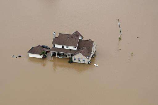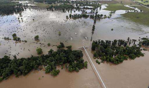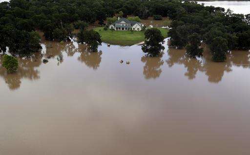 The Brazos River flows out of it's banks Saturday, June 4, 2016, in Simonton, Texas. Parts of Texas have been inundated with rain in the last week, and more than half of the state has been under flood watches or warnings. (AP Photo/David J. Phillip)