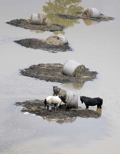 Horses surrounded by floodwaters are shown in this aerial view Saturday, June 4, 2016, in Rosharon, Texas. Parts of Texas have been inundated with rain in the last week, and more than half of the state has been under flood watches or warnings. (AP Photo/David J. Phillip)