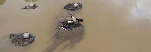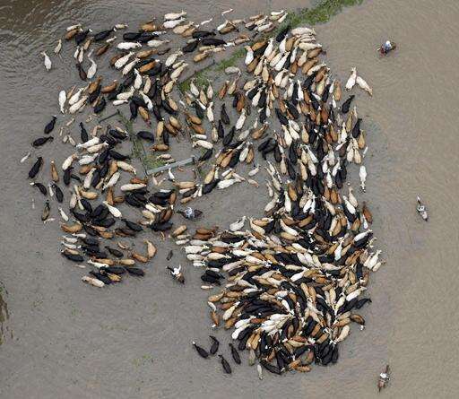 Cattle are herded through floodwaters toward higher ground, Saturday, June 4, 2016, near Chenango, Texas. Parts of Texas have been inundated with rain in the last week, and more than half of the state has been under flood watches or warnings. (AP Photo/David J. Phillip)