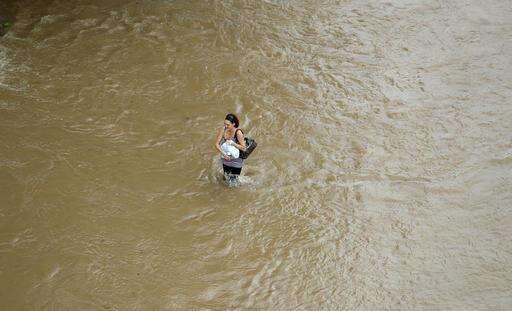 A woman walks through floodwaters Saturday, June 4, 2016, near Holiday Lakes, Texas. Parts of Texas have been inundated with rain in the last week, and more than half of the state has been under flood watches or warnings. (AP Photo/David J. Phillip)