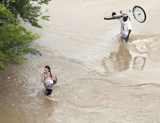A man carries a bicycle on his head as he and a woman walk through floodwaters Saturday, June 4, 2016, near Holiday Lakes, Texas. Parts of Texas have been inundated with rain in the last week, and more than half of the state has been under flood watches or warnings. (AP Photo/David J. Phillip)
