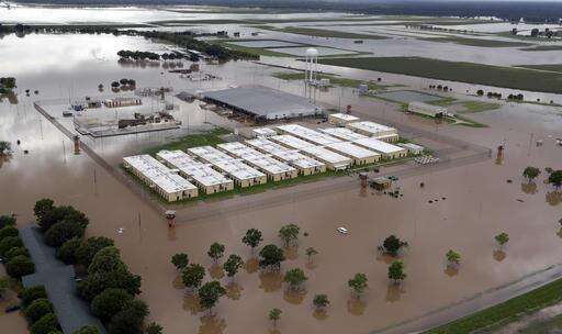 An evacuated Texas Department of Criminal Justice prison surrounded by floodwaters is shown in this aerial view near Lochridge, Texas, Saturday, June 4, 2016. Parts of Texas have been inundated with rain in the last week, and more than half of the state has been under flood watches or warnings. (AP Photo/David J. Phillip)