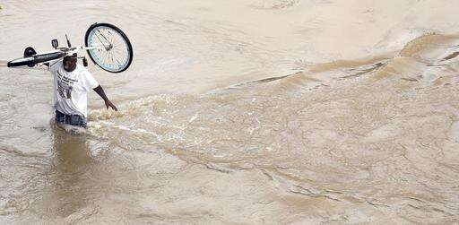 A man carries a bicycle on his head as he walks through floodwaters Saturday, June 4, 2016, near Holiday Lakes, Texas. Parts of Texas have been inundated with rain in the last week, and more than half of the state has been under flood watches or warnings. (AP Photo/David J. Phillip)