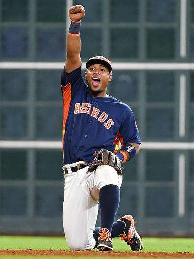 Houston Astros third baseman Luis Valbuena reacts after throwing out Oakland Athletics' Stephen Vogt to end a baseball game, Sunday, June 5, 2016, in Houston. (AP Photo/Eric Christian Smith) The Associated Press