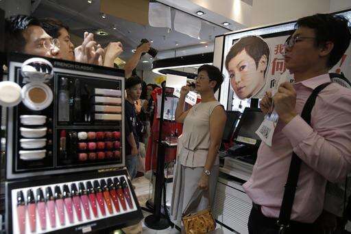 A protestor displays a placard at a Lancome counter inside a department store at Hong Kong's Times Square, Wednesday, June 8, 2016. French cosmetics company Lancome has sparked a backlash in Hong Kong after it canceled a promotional concert featuring a singer known for pro-democracy views, with many accusing it of caving in to political pressure from Beijing. (AP Photo/Kin Cheung)