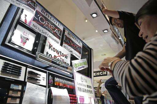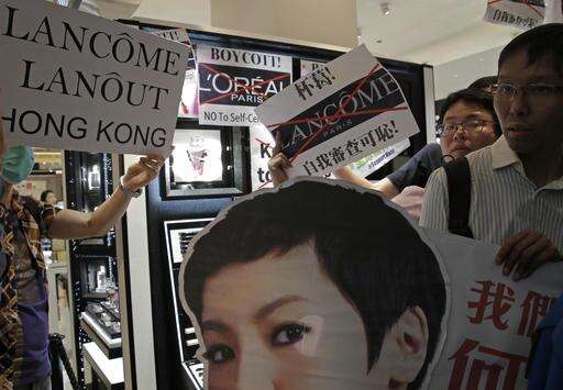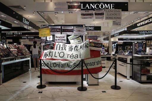 Several dozen protesters marched to an unstaffed Lancome counter in a downtown Hong Kong department store Tuesday. They taped up signs accusing the company of self-censorship and of kowtowing to Beijing and called for a boycott.