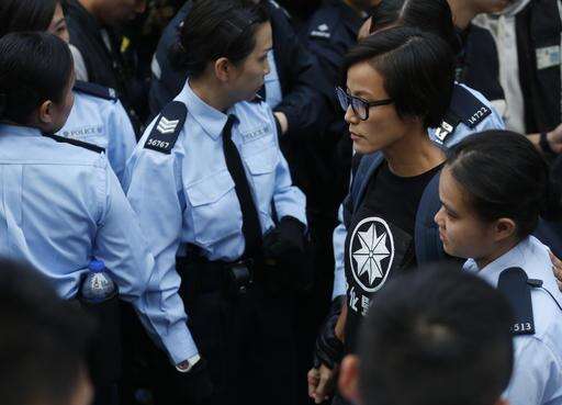 In this Dec. 11, 2014 photo, Cantopop singer and outspoken celebrity activist Denise Ho, is escorted by police officers during a sit-in rally at the occupied area outside government headquarters in Hong Kong. French cosmetics company Lancome has sparked a backlash in Hong Kong after it canceled a promotional concert featuring the singer known for pro-democracy views, with many accusing it of caving to political pressure from Beijing. Lancome said Sunday, June 5, 2016 on its Hong Kong Facebook page that the event had been canceled because of unspecified "safety reasons." It It also sought to distance itself from Ho in a separate post, saying that she's not its spokesperson. (AP Photo/Kin Cheung)