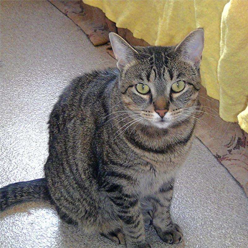 • Magoo is a female with very unusual markings. She has a very golden tortie body with a tabby marked face. Because of this, most pictures of her make it look like her head has been photo-shopped into the picture. She came to Buddy when her owner developed medical problems and could no longer look after Magoo and the dog that lived with her.