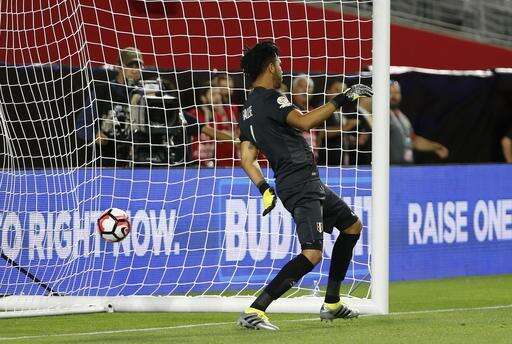 Peru goalie Pedro Gallese gives up a goal to Ecuador during the first half of a Copa America group C soccer match Wednesday, June 8, 2016, in Glendale, Ariz. (AP Photo/Ross D. Franklin)
