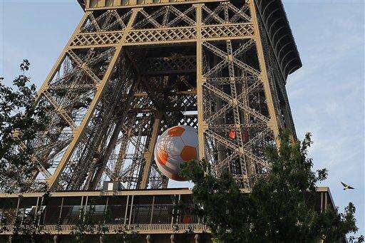 A giant soccer ball hangs at the Eiffel Tower as part of the upcoming Euro 2016 Soccer Championship in Paris, Thursday, June 9, 2016. (AP Photo/Francois Mori)