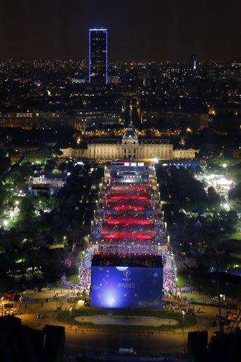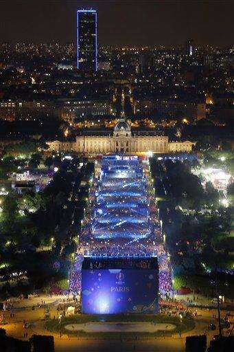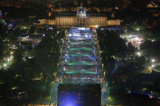 General view of the soccer fan zone on the Champ de Mars near the Eiffel Tower during a concert of French electro music DJ David Guetta as part of the Euro 2016 Soccer Championship in Paris, Thursday, June 9, 2016. (AP Photo/Francois Mori)
