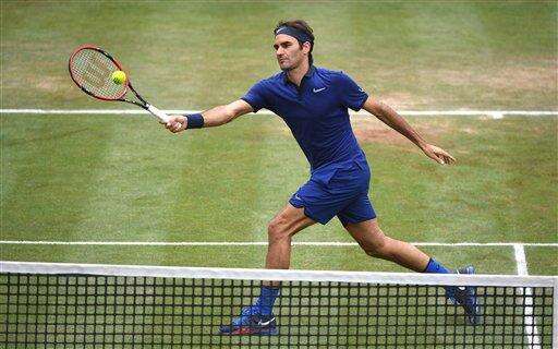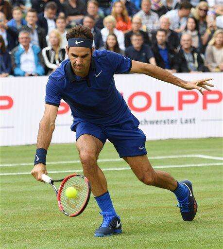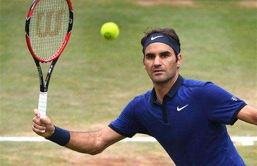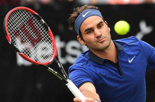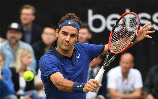 Roger Federer from Switzerland returns a ball to Dominic Thiem from Austria during the semifinal match of the MercedesCup ATP tennis tournament in Stuttgart, Germany, Saturday June 11, 2016. (Marijan Murat/dpa via AP)