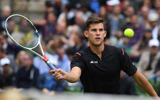 Dominic Thiem from Austria returns a ball to Roger Federer from Switzerland during the semifinals at the MercedesCup ATP tennis tournament in Stuttgart, Germany, Saturday June 11, 2016. (Marijan Murat/dpa via AP)