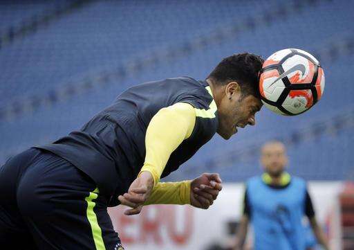 Brazil's Hulk heads the ball during a Copa America Group B soccer practice at Gillette Stadium, Saturday, June 11, 2016, in Foxborough, Mass. Brazil faces Peru on Sunday in a Group B match. (AP Photo/Elise Amendola)