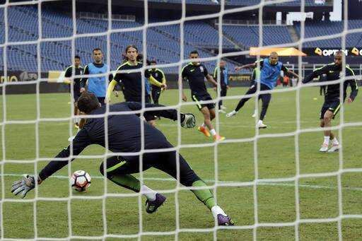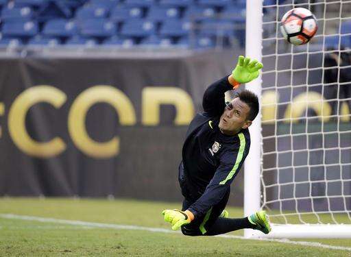 Brazil goalkeeper Diego Alves reacts on the pitch during a Copa America Group B soccer practice at Gillette Stadium, Saturday, June 11, 2016, in Foxborough, Mass. Brazil faces Peru on Sunday in a Group B match. (AP Photo/Elise Amendola)