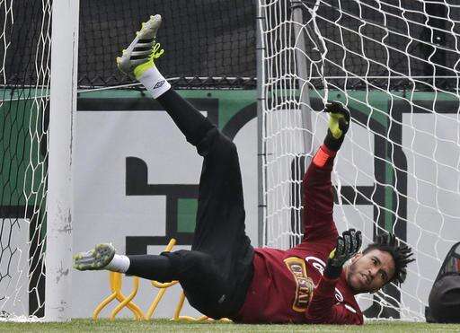 Peru goalkeeper Pedro Gallese rolls after making a save during a Copa America Group B soccer practice at Babson College Saturday, June 11, 2016, in Wellesley, Mass. Peru faces Brazil on Sunday at Gillette Stadium in Foxborough, Mass. (AP Photo/Charles Krupa)
