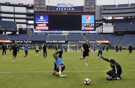 Brazil players joke around after a Copa America Group B soccer practice at Gillette Stadium, Saturday, June 11, 2016, in Foxborough, Mass. Brazil faces Peru on Sunday in a Group B match. (AP Photo/Elise Amendola)