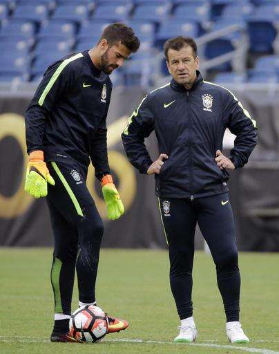 Brazil head coach Dunga, right, speaks to goalkeeper Alisson during a Copa America Group B soccer practice at Gillette Stadium, Saturday, June 11, 2016, in Foxborough, Mass. Brazil faces Peru on Sunday in a Group B match. (AP Photo/Elise Amendola)