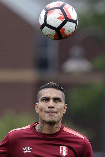 Peru forward Paolo Guerrero eyes the ball while lining up a header during a Copa America Group B soccer practice at Babson College Saturday, June 11, 2016, in Wellesley, Mass. Peru faces Brazil on Sunday at Gillette Stadium in Foxborough, Mass. (AP Photo/Charles Krupa)
