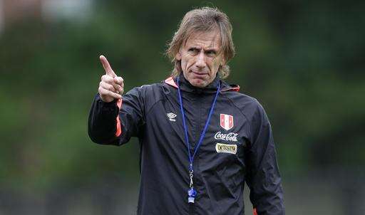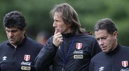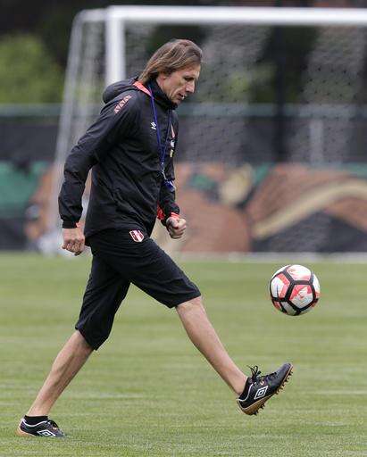 Peru coach Ricardo Gareca gestures during a Copa America Group B soccer practice at Babson College Saturday, June 11, 2016, in Wellesley, Mass. Peru faces Brazil on Sunday at Gillette Stadium in Foxborough, Mass. (AP Photo/Charles Krupa)