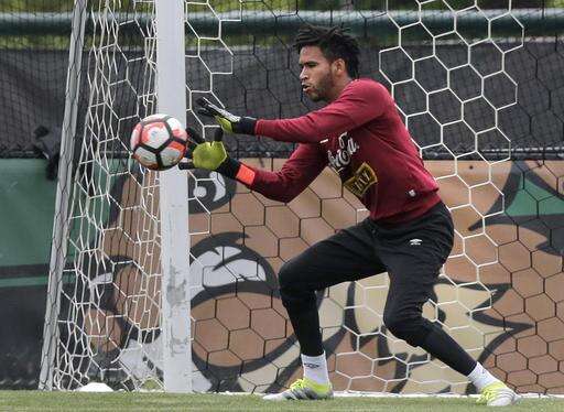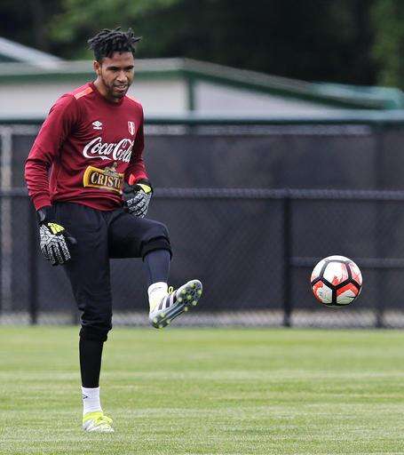 Peru goalkeeper Pedro Gallese kicks the ball while warming up during a Copa America Group B soccer practice at Babson College Saturday, June 11, 2016, in Wellesley, Mass. Peru faces Brazil on Sunday at Gillette Stadium in Foxborough, Mass. (AP Photo/Charles Krupa)
