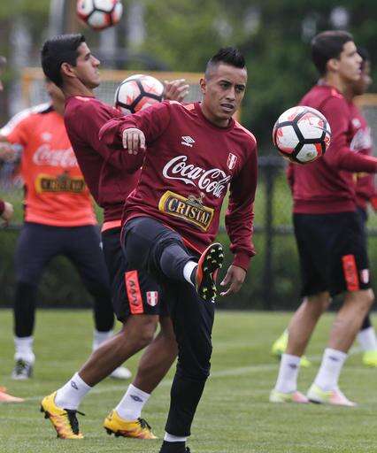 Peru forward Christian Cueva kicks the ball while warming up during a Copa America Group B soccer practice at Babson College Saturday, June 11, 2016, in Wellesley, Mass. Peru faces Brazil on Sunday at Gillette Stadium in Foxborough, Mass. (AP Photo/Charles Krupa)