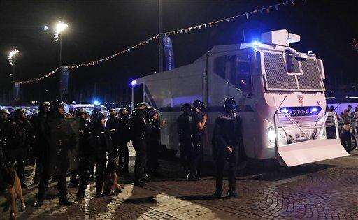 French police stand near a water cannon after the Euro 2016 soccer championship group B match between England and Russia in Marseille, France Saturday, June 11, 2016. Clashes between soccer fans Saturday in Marseille's Old Port occurred for a third straight day of violence in the city. (AP Photo/Darko Bandic) The Associated Press