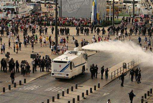 Police fire water cannons to control the fighting fter football fans clashed ahead of the England v Russia Euro 2016 soccer match, in Marseille, France, Saturday June 11, 2016. Riot police have used tear gas canisters during clashes with soccer fans Saturday in Marseille's Old Port in a third straight day of violence during the Euro 2016 championships. (Niall Carson / PA via AP) UNITED KINGDOM OUT - NO SALES - NO ARCHIVES The Associated Press