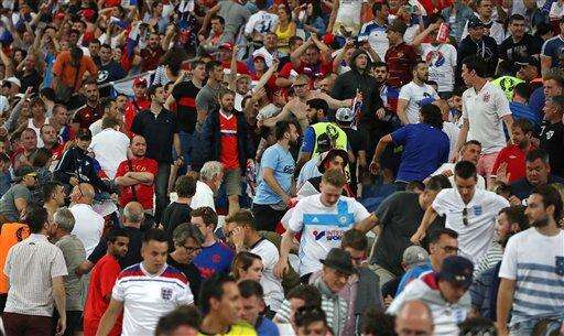 Russian supporters charges at England fans in the stands at the end of the Euro 2016 Group B soccer match between England and Russia, at the Velodrome stadium in Marseille, France, Saturday, June 11, 2016. (AP Photo/Thanassis Stavrakis) The Associated Press
