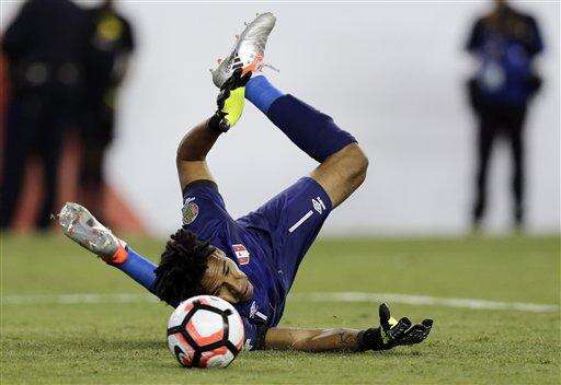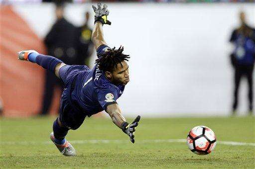 Peruâs goalkeeper Pedro Gallese dives for the ball during the first half of a Copa America Group B soccer match against Brazil on Sunday, June 12, 2016, in Foxborough, Mass. (AP Photo/Charles Krupa)