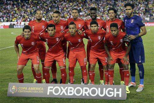 The Peru national team poses for a group photograph before a Copa America Group B soccer match against Brazil on Sunday, June 12, 2016, in Foxborough, Mass. (AP Photo/Charles Krupa)