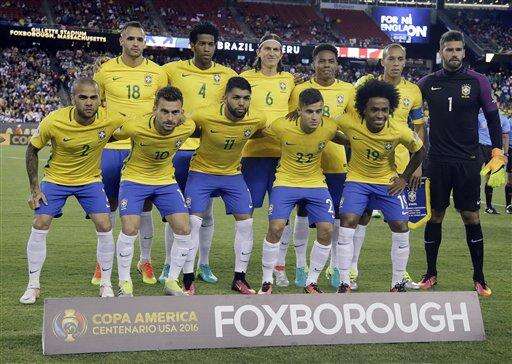 The Brazil national team poses for a group photo before a Copa America Group B soccer match against Peru on Sunday, June 12, 2016, in Foxborough, Mass. (AP Photo/Elise Amendola)