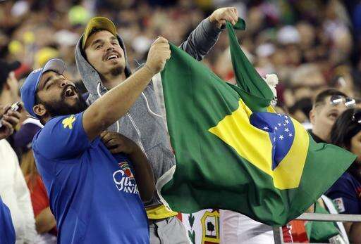 Brazil supporters cheer their team before a Copa America Group B soccer match between Brazil and Peru Sunday, June 12, 2016, in Foxborough, Mass. (AP Photo/Steven Senne)